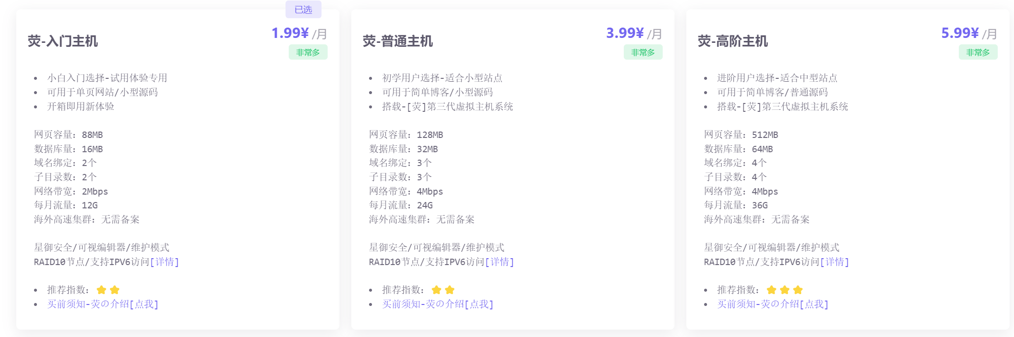 注册完从虚拟主机里购买一个套餐就可以,越贵的主机能承载的浏览量就越大,但是个人网站的话没有那么多人看,所以还是性价比为主(),注意下主机的存储空间,如果是想用网站存一些视频之类的话还是大一点好。